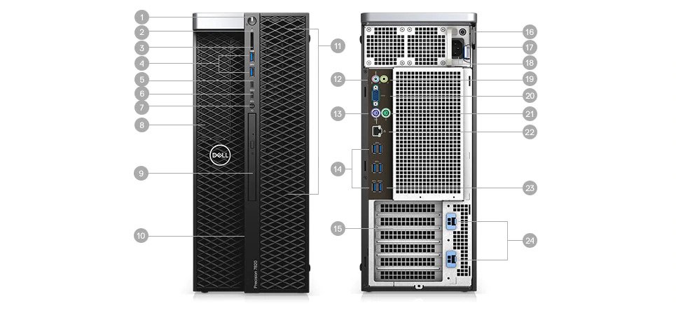 1. Power button/Power light | 2. Drive activity light | 3. SD card slot | 4. USB 3.1 ports | 5. USB 3.1 Type-C™ port with PowerShare | 6. USB 3.1 Type-C™ port | 7. Headset port | 8. 5.25 inch bay (optional) | 9. Optical drive | 10. Drive access release latch | 11. Drive carriers | 12. Microphone/Line-in port | 13. PS/2 Mouse port | 14. USB 3.1 ports | 15. Discrete graphics card slot (optional) | 16. Padlock ring | 17. Security cable slot | 18. Power cable connector | 19. Line-out port | 20. Serial port | 21. PS/2 Keyboard port | 22. Network port | 23. USB 3.1 port (supports smart Power-On) | 24. Expansion card slots