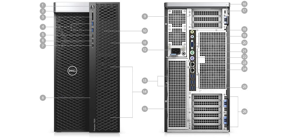 1. Power button/Power light | 2. Drive activity light | 3. SD card slot | 4. USB 3.0 ports | 5. USB 3.0 Type-C port with PowerShare | 6. USB 3.0 Type-C port | 7. Headset port | 8. Drive access release latch | 9. Expansion card slots | 10. 5.25 inch bay (optional) | 11. Optical drive | 12. Power cable connector | 13. USB 3.0 ports | 14. Drive carriers | 15. Discrete graphics card slot (optional) | 16. Security cable slot | 17. Padlock ring | 18. Line-out port | 19. Microphone/Line-in port | 20. Serial port | 21. PS/2 Mouse port | 22. PS/2 Keyboard port | 23. Network port (managed optionally) | 24. Network port | 25. USB 3.0 port (supports smart Power-On) | 26. Expansion card slots